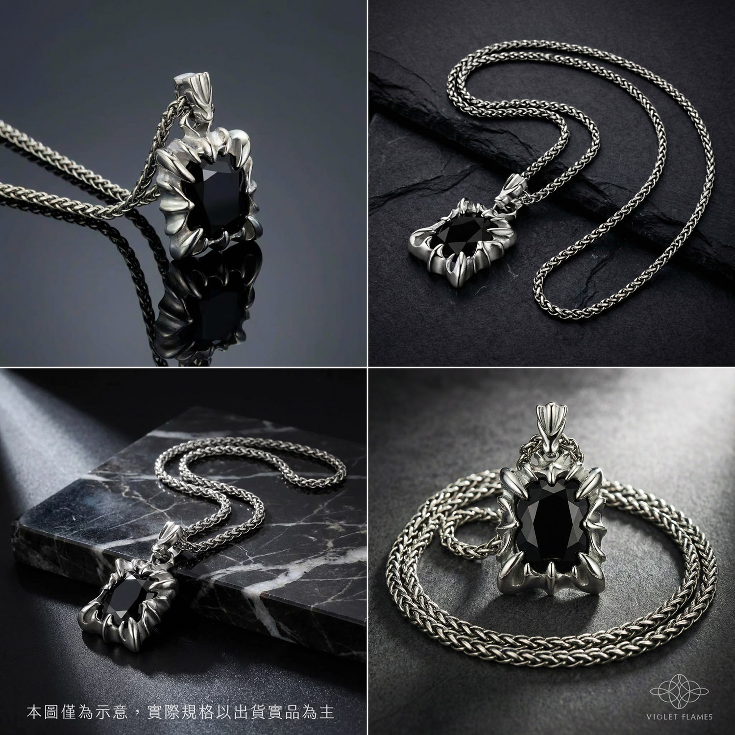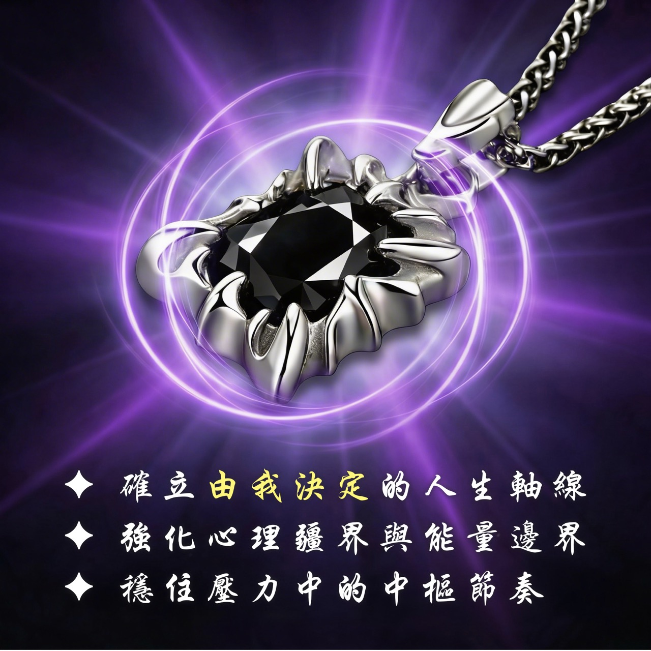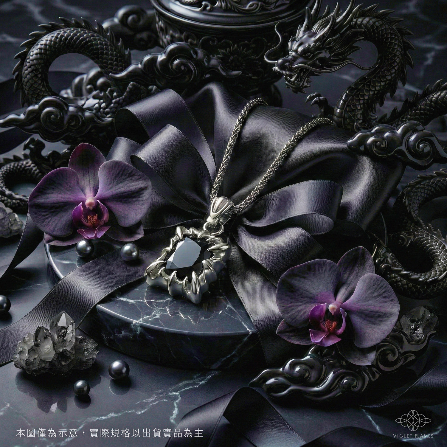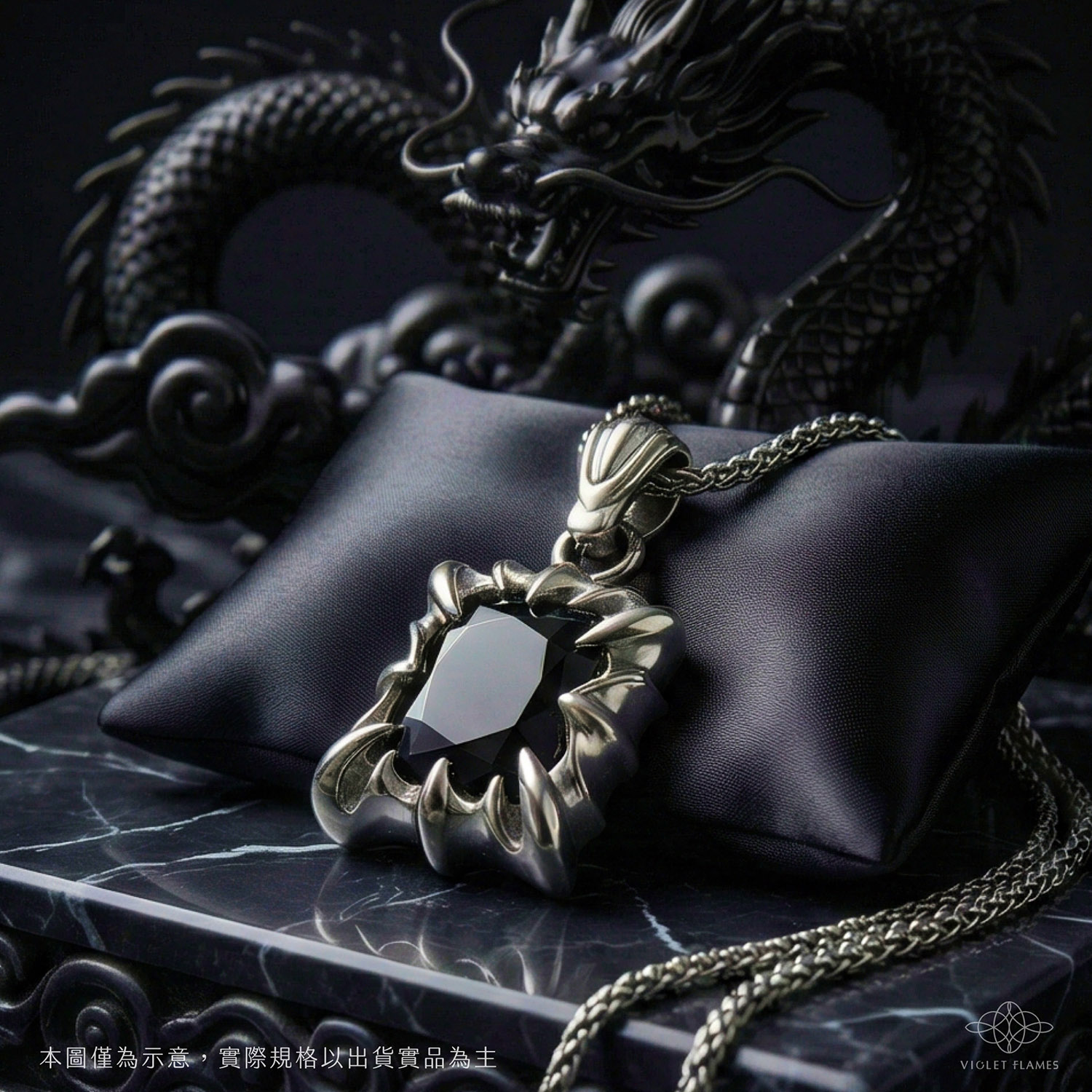 - 能量傳導: 我們特意選用「銀」來做底座與鍊子,也是因為銀的能量導通性極佳。配合高淨度的培育黑色莫桑石,能讓黑龍王的守護力量最無阻礙地傳遞給行者。