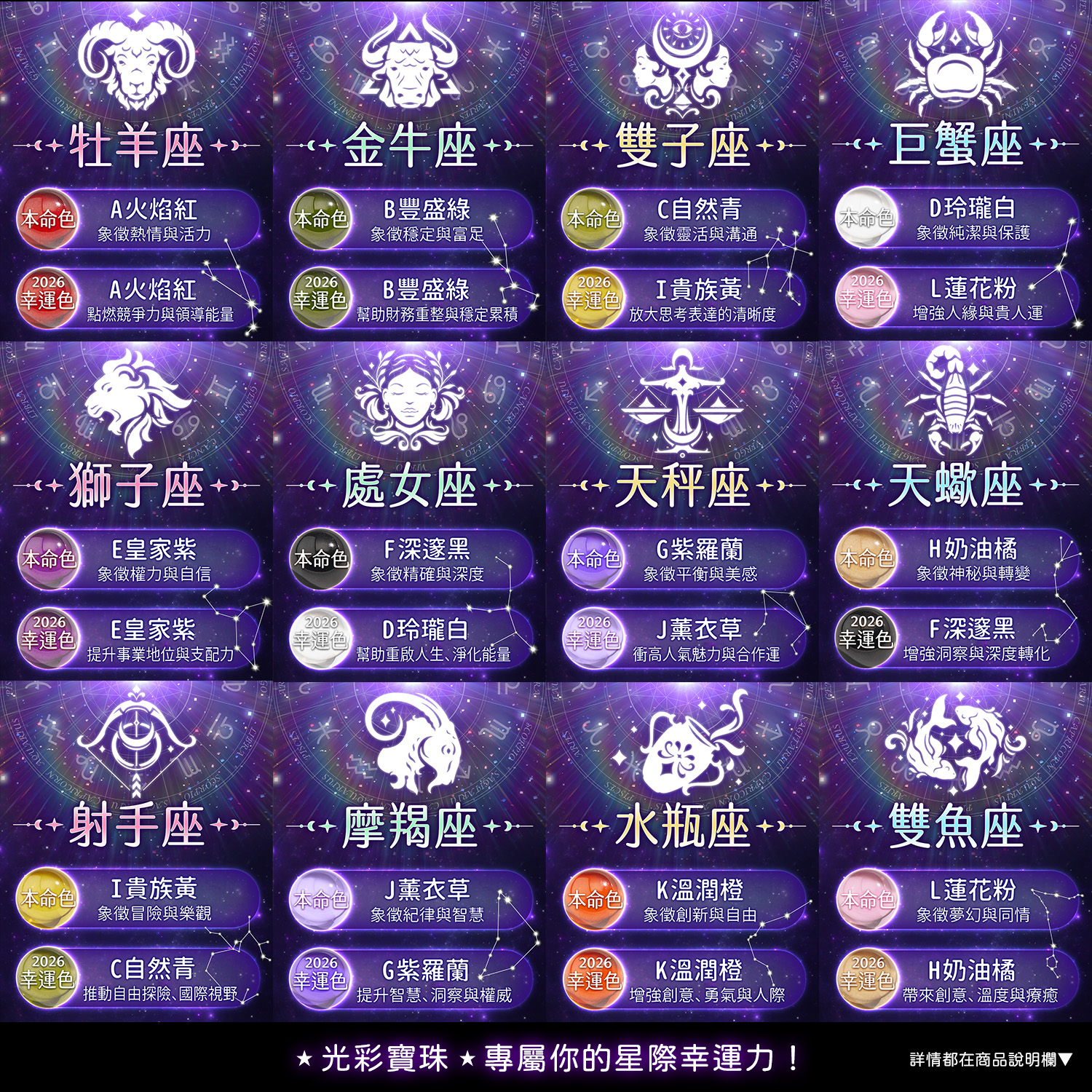 光彩寶珠擁有12個絕美的顏色設計,您可以依照您的太陽星座來選擇【本命色】或【2026年幸運色】為您增添本命能量或該年度趨勢所需的幸運能量。請參照『星座與顏色對照表』圖示說明。