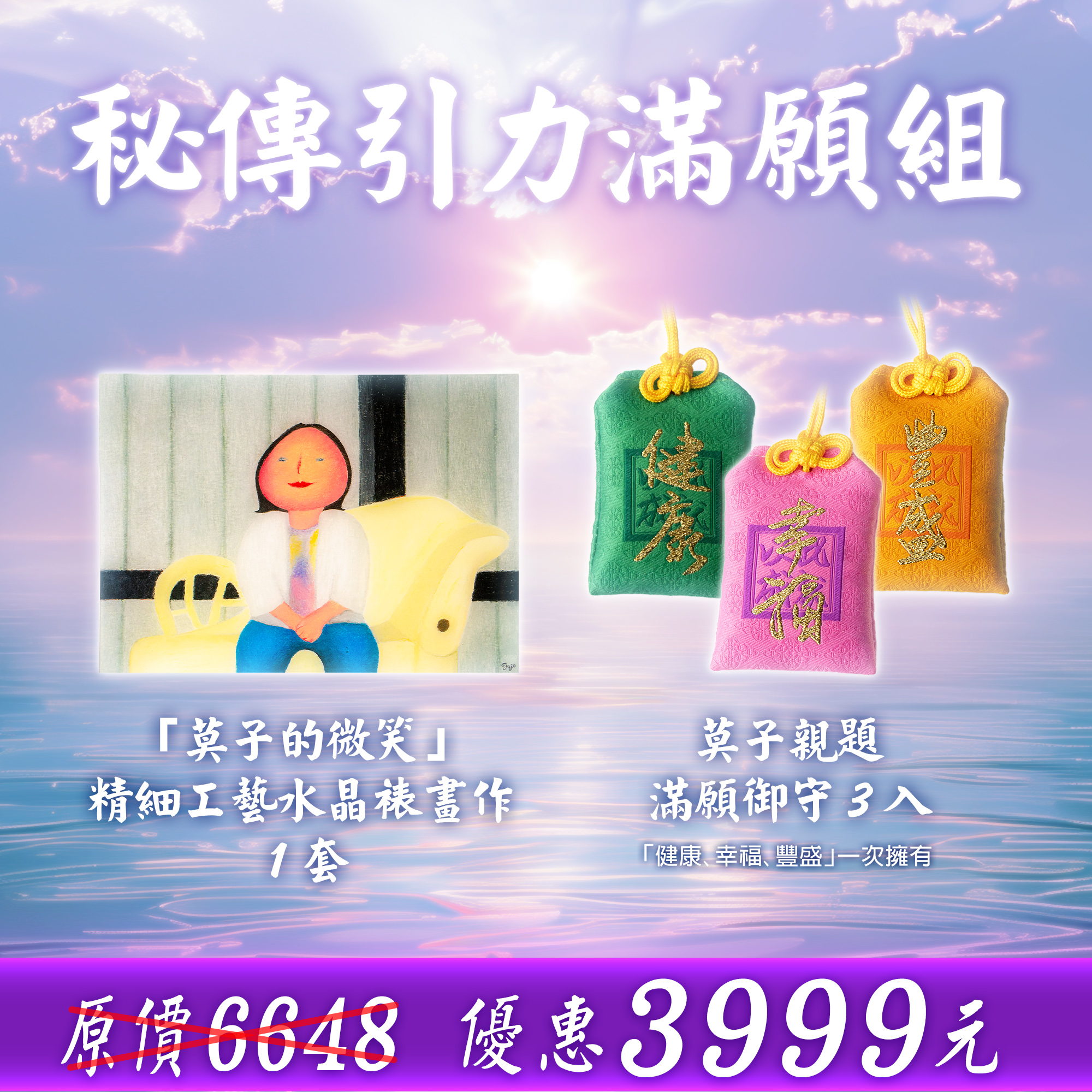 「莫子的微笑」精細工藝水晶裱畫作+新款3入組「滿願御守」
