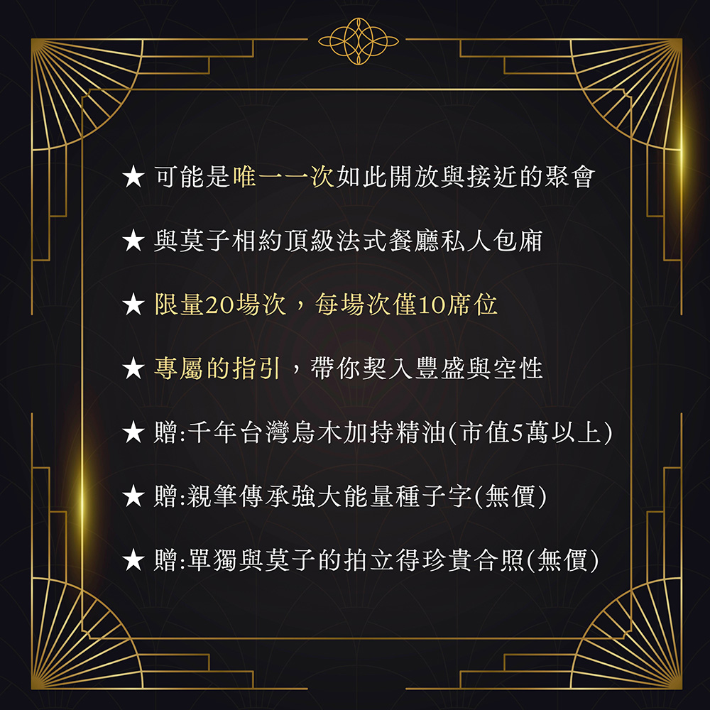 還有更多為此次精心準備的多項好禮,如:五千年台灣烏木肖楠能量加持精油(市值5萬以上)、頂級豐盛饗宴引導(餐點市值5千以上)、親筆傳承強大能量種子字(無價)、與莫子的珍貴合照……等。