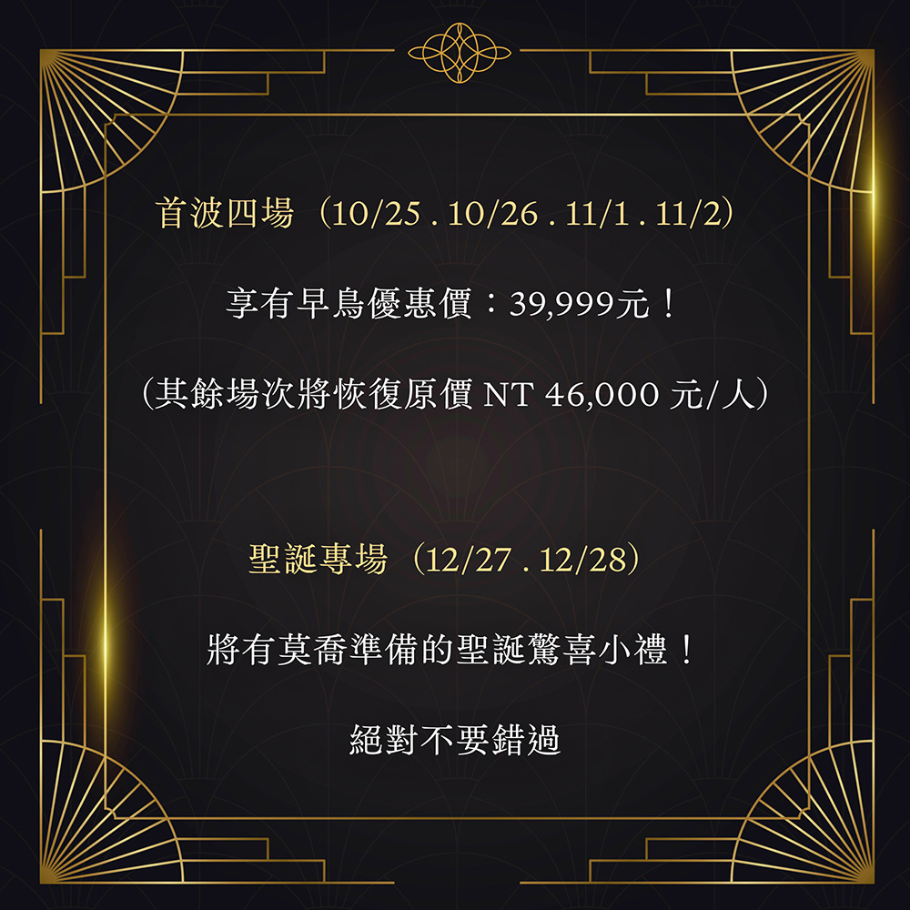 於10月底至12月,每周六日晚餐時刻,NT$39,999~46,000/人,敬請把握。